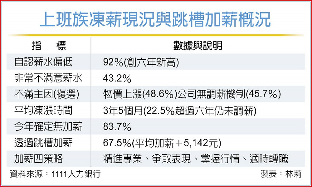 1111人力銀行21日發布調查指出,九成二上班族自認薪水偏低,其中四成三更對薪水感到非常不滿意。人力銀行表示,造成薪資不滿的主因之一為企業缺乏明確調薪機制,受訪者平均在同一職位凍漲3年5個月。為提升薪資水準,67.5%上班族選擇跳槽加薪,平均薪水一次增加5,142元。