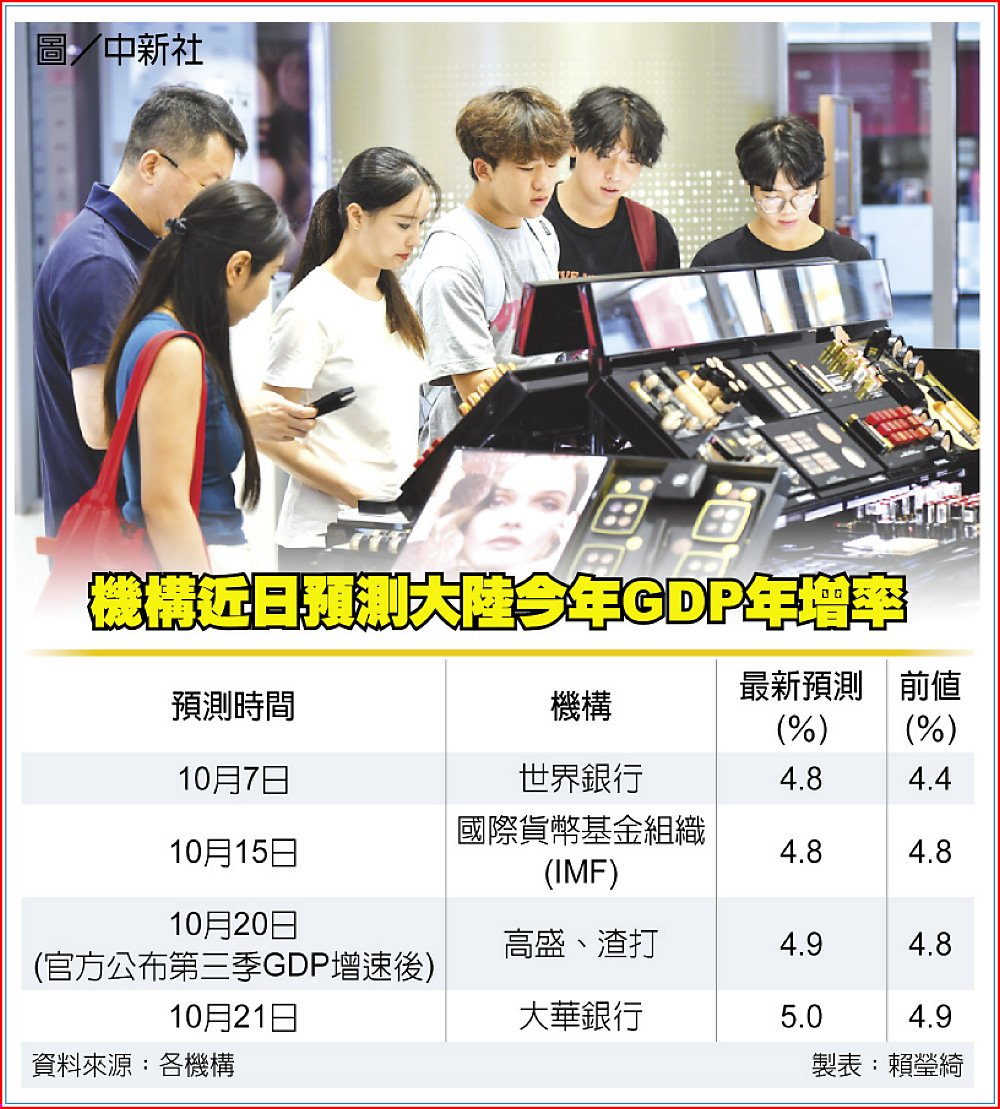 渣打表示,鑑於第三季增長超預期,將今年增長預測上調0.1個百分點至4.9%,但維持第四季年增4.4%的預測。高盛以同一理由上調今年大陸GDP預測,同樣從4.8%升至4.9%,預測明年增速由4.2%上調至4.3%。