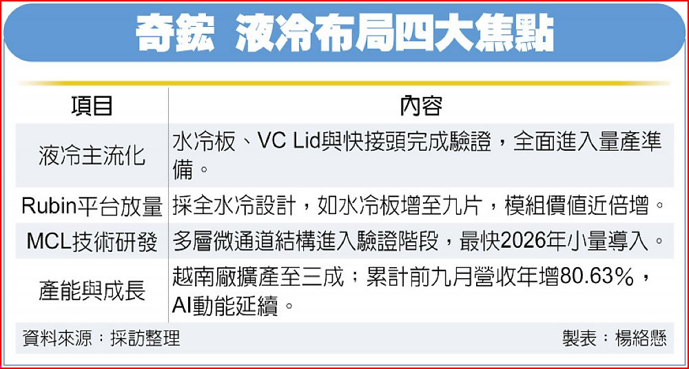 此外,奇鋐也推進新一代多層微通道(MCL)結構技術,應對Kyber架構帶來的更高瓦數挑戰,該技術仍在研發與驗證階段,就時程來看,MCL預期最快於2026年下半年小量導入,即先由水冷板小量試產,再逐步放量。