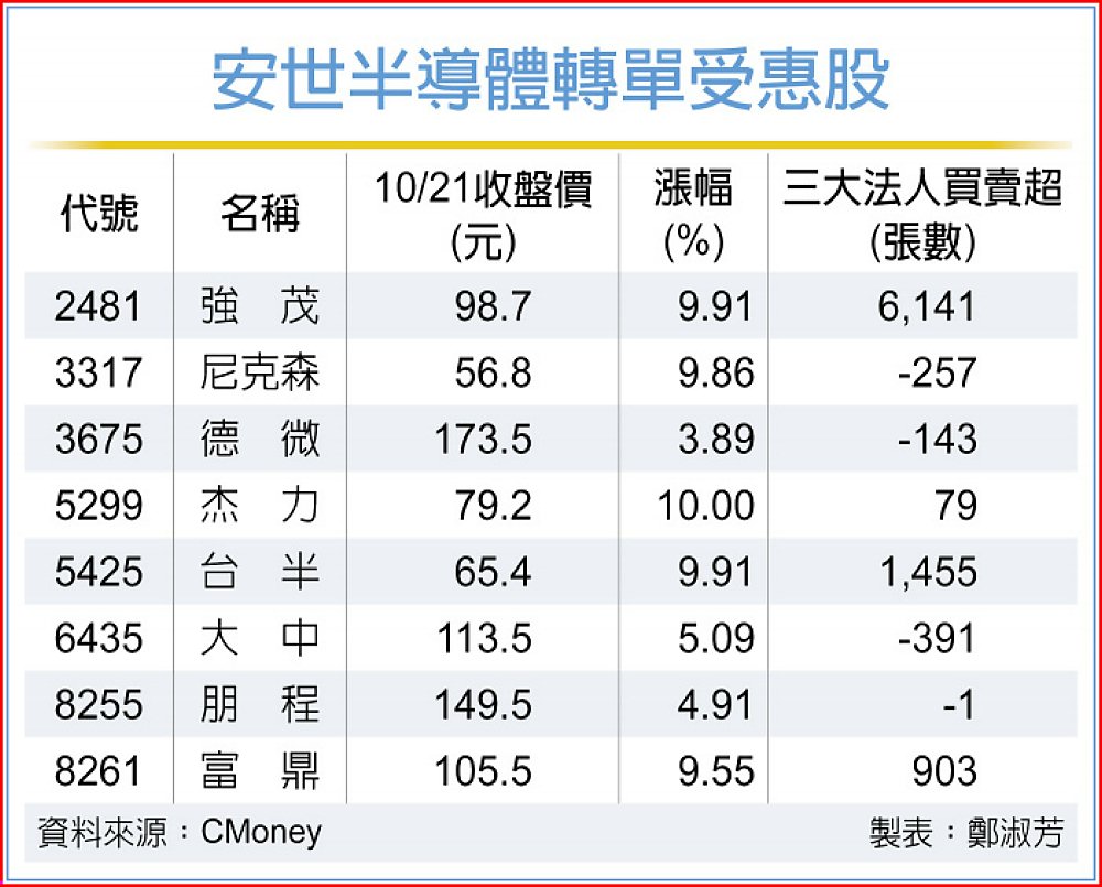 著眼於安世在全球汽車供應鏈居關鍵要角,,為免出現斷鏈危機,歐美車廠只得尋求其他同業襄助,台廠頓成轉單首選,包括台半、強茂、朋程、富鼎近期均有急單浮現。其中尤以台半受惠最深。