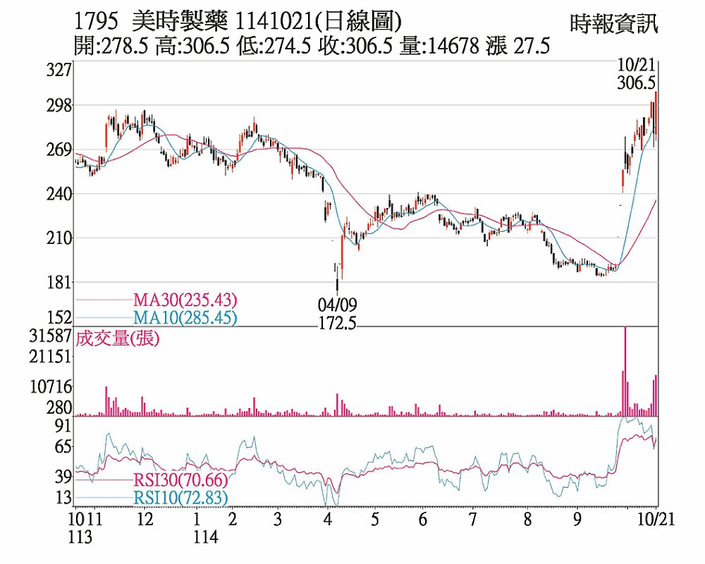 美時(1795)力拚年底完成合併Alvogen,成明年業績跳升保證,法人看好營收有機會超過350億元,每股盈餘至少25元起跳,激勵21日股價帶量走揚,終場收漲停價306.5元,成交量1.43萬張,並有逾1.55萬張買單高掛。
