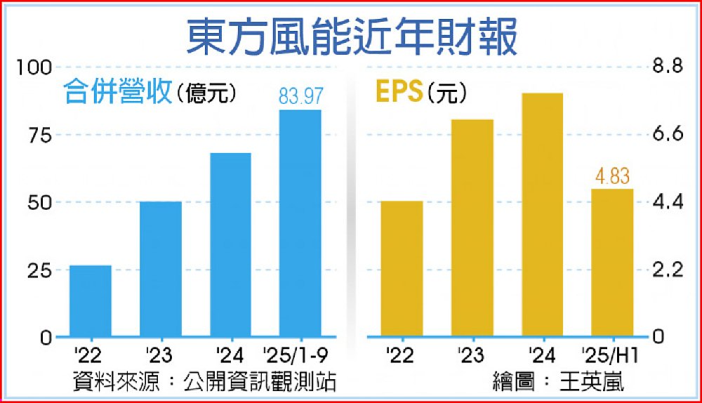 根據東方風能財報顯示,近三年營收都是以高雙位數成長;2023年營收50.06億元、年增90.1%,2024年營收68.18億元、年增36.2%,今年前三季營收83.97億元、年增57.8%。