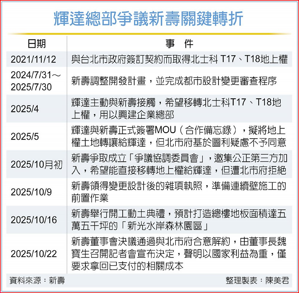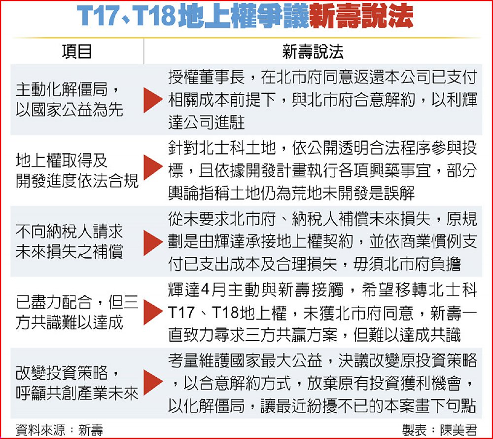 輝達今年4月主動與新壽接觸,希望移轉北士科T17、T18地上權,未獲北市府同意,新壽致力尋求三方共贏方案,但輝達堅持自行興建總部;北市府憂心圖利,主張建物須興建完成後始得移轉,亦拒絕輝達共同參與地上物興建,新壽雖同意配合北市府要求,完工後再移轉等變通方案,但未獲輝達同意,致使三方無法達成共識。