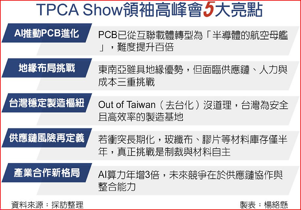 TPCA Show於22日舉行「領袖高峰會」,綜觀全球產業布局。臻鼎營運長李定轉指出,AI時代正開啟「PCB的黃金十年」,然東南亞廠區正面臨供應鏈、人力與成本三重挑戰,需提升製造效率與反應速度,才能在新一輪技術戰中奠定領先地位。而以地緣布局來看,台光電董事長董定宇則強調,台灣是穩定、安全的製造樞紐,擁有成熟聚落與完善體系,不應被誤判為高風險區域。