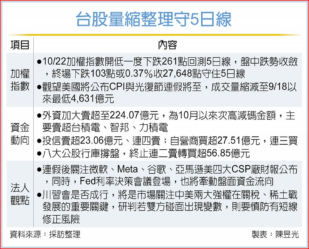 高檔調節壓力、美國即將在周五公布9月消費者物價指數(CPI)與連假在即影響,在外資鎖定台積電、擴大對台股賣超224億元,加權指數開低、一度重挫261點跌破5日線27,608點,在買盤進場馳援情況下一度向上拉升向平盤靠攏,惟最後一盤仍見避險賣盤調節,加權指數終場下跌103點收27,648點,但成功守住5日線,成交量降至一個月以來最低4,631億元。