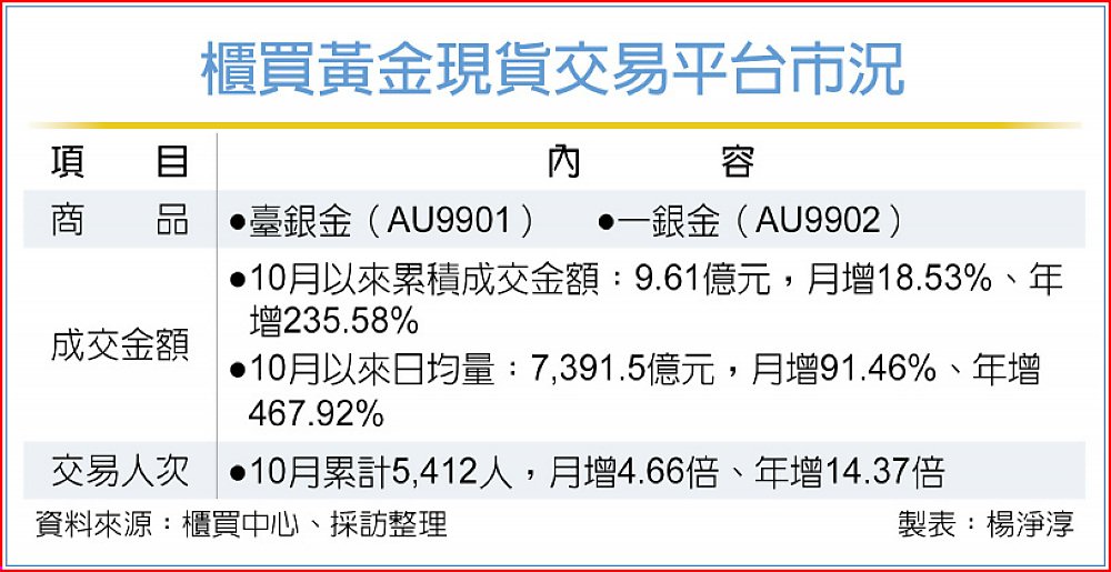 黃金價格今年以來頻頻創下歷史新高,黃金相關標的引發市場高度關注,而櫃買黃金現貨交易平台自10月起,將最小交易單位由先前的「1台兩」(37.5公克)縮小為「1台錢」(3.75公克),交易單位降低吸引投資人湧入且推升交易量,上線後不到一個月,日均成交量幾乎翻倍且交易人次成長近5倍。