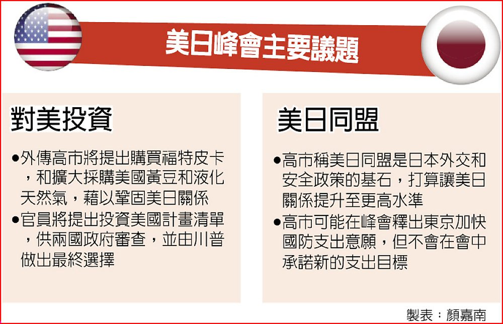 美日貿易是會談的另一大重點。日本在貿易談判同意投資美國5,500億美元,換取較低的關稅稅率,美日元首預料將敲定投資細節。消息人士表示,高市將提出購買福特皮卡、採購更多美國大豆和液化天然氣。不過高市可能不會在會中承諾提高國防支出。