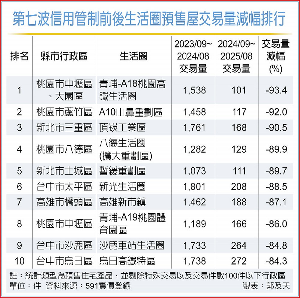 中央銀行去年9月推出第七波信用管制一年來,造成全台預售屋市場交易急凍。據591統計,打炒房前後一年各生活圈的預售屋交易量變化,不少區域僅剩約1成,其中以桃園青埔A18高鐵生活圈減少93.4%最高,桃園A10山鼻、三重頂崁工業區縮減均逾9成,前十大量縮區幾乎多為重劃區,其中又以桃園、台中等重劃區密集、過去建商推案熱絡的地區,交易量萎縮最為顯著。