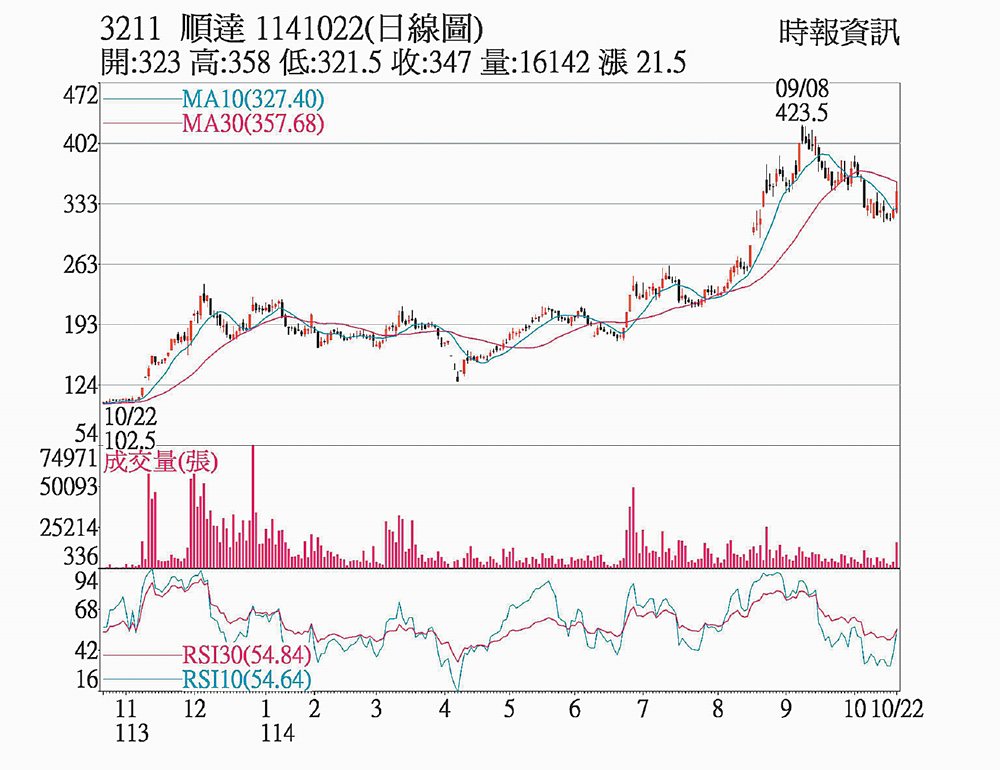 資金湧進BBU族群,相關類股全面大漲。順達(3211)股價止跌回穩,22日開低走高一度觸及漲停,終場漲幅收斂至6.61%作收,收盤價347元,成交量放大到1.6萬張。