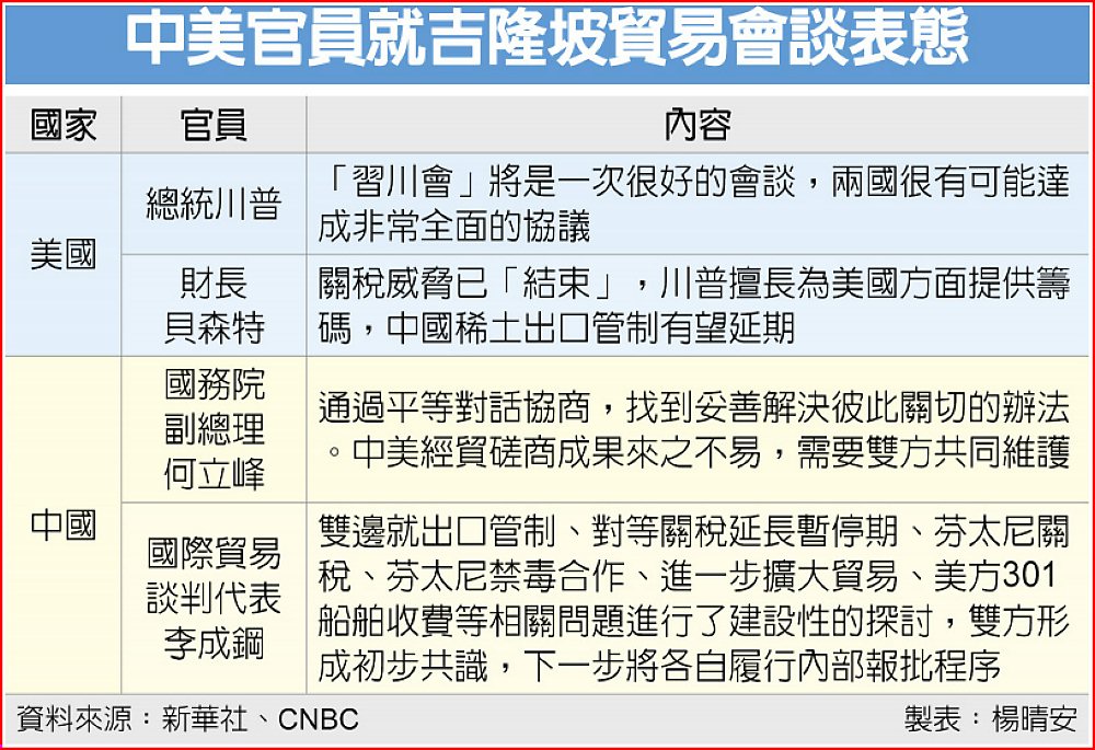 與此同時,中美經貿會談告一段落。CNBC引述美國財長貝森特(Scott Bessent)表示,經過為期兩天的談判,中國已準備好達成協議,雙方為「習川會」擬定架構,避免美國因稀土議題對中國實施100%關稅,且預計中國將在某種程度上延遲稀土出口管制措施。他強調,關稅威脅已「結束」,有賴川普擅長為美國方面提供籌碼。