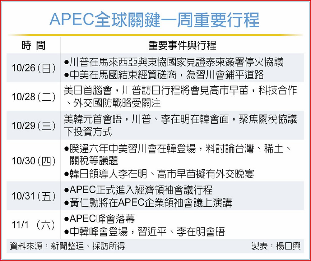 在慶州,美韓元首「川李會」預計29日舉行,關稅協議投資3,500億美元真正輪廓或進一步清晰。萬眾矚目的中美習川會30日登場,將在台灣、稀土、關稅、芬太尼等議題角力。10月31日至11月1日,APEC進入峰會時間,而峰會落幕後,中韓習李會晤隨即登場。在此之前,APEC前哨戰已在馬來西亞和日本開打,中美財經高層在吉隆坡會談為習川會開路。川普結束馬國行程後,也將自27日先訪日陸續會見天皇、首相高市。