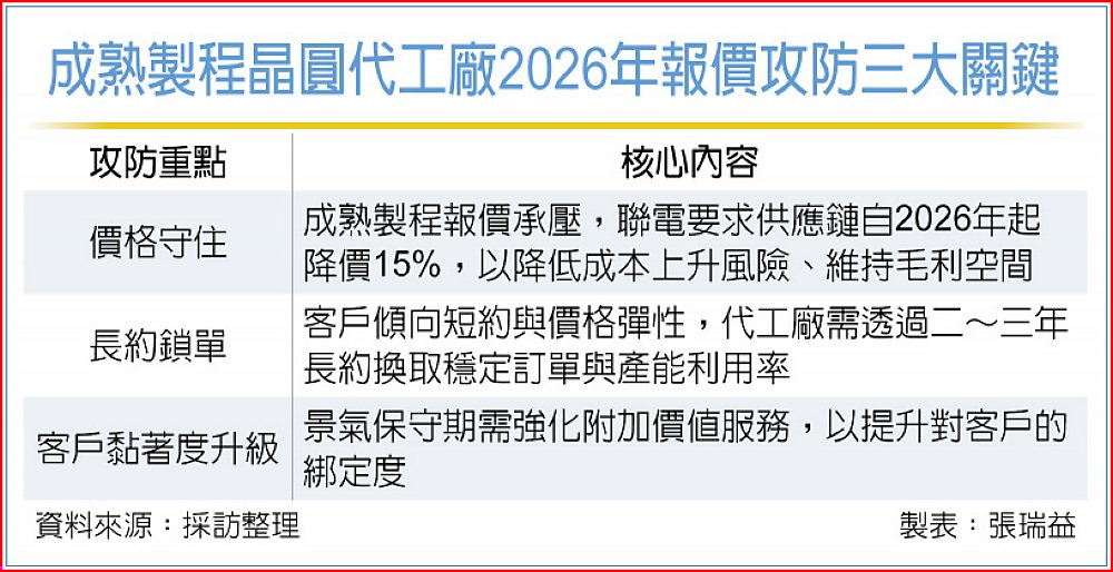 供應鏈業者指出,這場2026年價格攻防戰,將考驗晶圓代工廠三大應對能力:一是如何在不侵蝕毛利的前提下守住價格底線;二是爭取與客戶簽訂涵蓋二~三年、條款穩定的長期合約,換取訂單可預測性與產能配置彈性;三是藉提供設計支援、整合測試、協同開發等附加服務,深度關聯核心客戶,穩固競爭護城河。