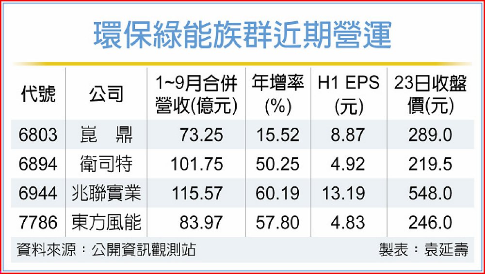 ESG成企業追求永續發展指標,循環經濟與綠能的布局,加大相關處理回收系統與工程的投資,節能環保概念股商機擴大,兆聯實業(6944)、東方風能(7786)、崑鼎(6803)、衛司特(6894)等企業,手中訂單量持續衝高,在「訂單為王」下,已被市場視為盤面上同族群的領頭羊。