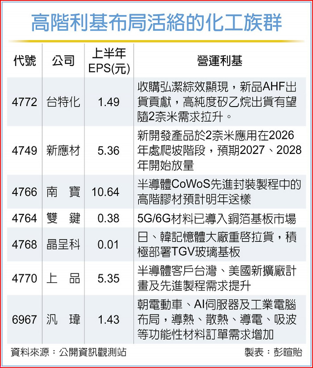 半導體、電子產業活絡推展,特用化學品、電子化學品穩健升溫,支撐化工族群營運穩步推進,尤其高階製程需求成長,加上利基新品出貨推進,新應材(4749)、台特化(4772)、上品(4770)、汎瑋(6967)、南寶(4766)、晶呈科(4768)、雙鍵(4764)營運動能更上層樓。