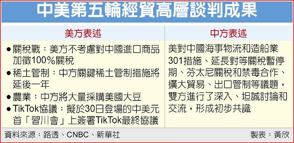 值得注意的是,川普27日在空軍一號專機暗示,他將根據與習近平會談結果,考慮是否放棄對「中國是否違反其第一任期貿易協議」的調查,並強調「很有機會達成全面性協議」。他並表示將要求北京恢復採購美國大豆、取締非法出口製造芬太尼的化學原料,並放寬稀土出口管制。