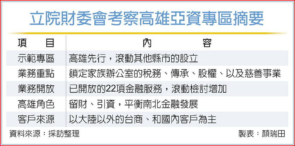 立法院財政委員會27日南下,考察亞洲資產管理中心高雄示範專區的業務運作,立委關心未來如何評估專區效益,及是否開放其他縣市跟進設立專區。對此金管會副主委莊琇媛指出,亞資中心將以高雄優先試行,至於其他縣市,將根據各縣市的產業條件,進行滾動檢討,銀行局長童政彰則提醒,在服務高資產客戶族群時,也應注意洗錢防制問題。