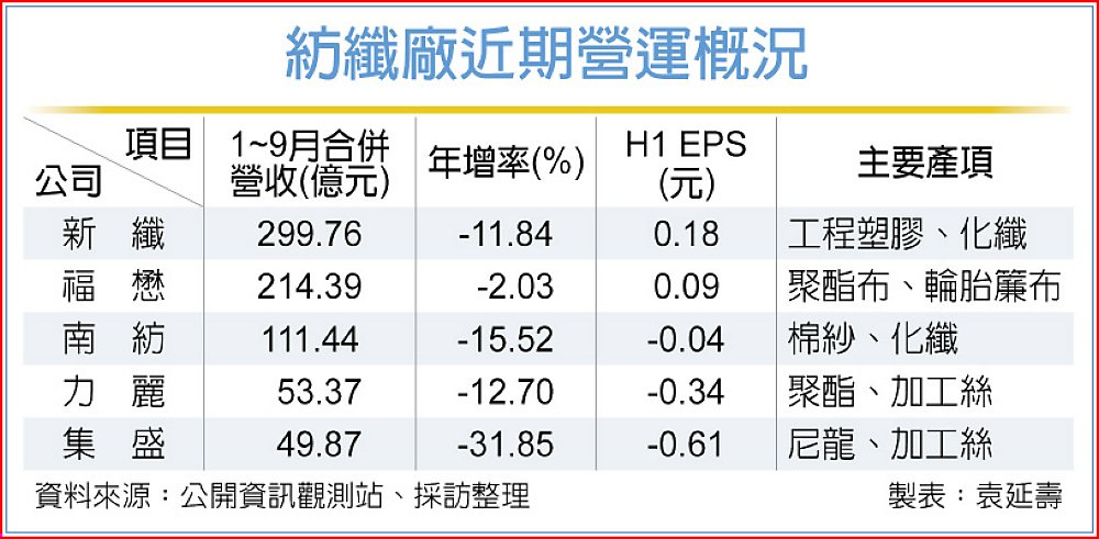 面臨中國低價競爭與全球需求保守壓力,福懋秋冬產能利用率約達9成以上,春夏約7成。南紡上半年每股小虧0.04元,目前化纖事業群平均稼動率約6至7成。