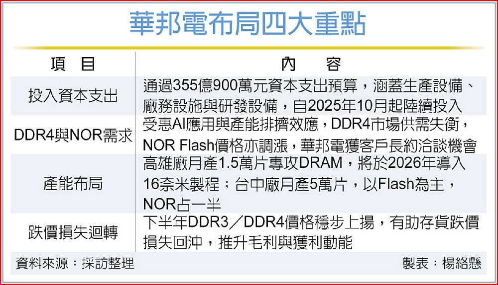 記憶體價格反轉向上、產能逐步回歸滿載之際,華邦電(2344)27日董事會通過核准355.09億元資本支出預算,涵蓋生產設備、廠務設施與研發設備三大領域,資金將由自有資金與銀行融資共同支應,預計自今年10月起陸續投入,較年初2月公布資本支出預算53億元,調高近5.7倍,更是近期罕見的大規模擴產動作。