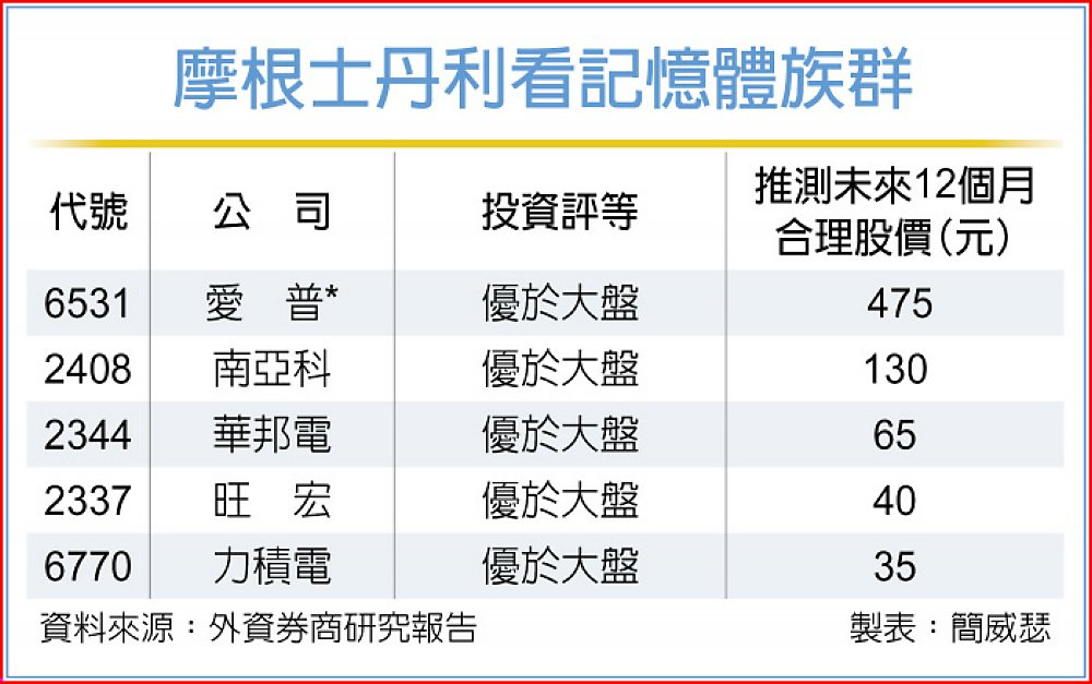 摩根士丹利除升評力積電,同步將南亞科、華邦電、旺宏、愛普*推測合理股價分別調升到130元、65元、40元、475元。大摩並認為,市場低估了DDR4在企業與資料中心交換器中的採用情況,若沒有DDR4,無論是GPU抑或是ASIC伺服器機櫃皆無法出貨。