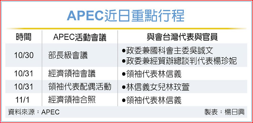 林信義28日在登機前就表示,APEC是台灣少數跟其他會員國平等互動的場域,在政經多變局勢下更次難得,尤其公私部門、企業團體更急迫要共尋解方,利用此機會,不但能與各國領袖,也和企業代表會面會面,行銷台灣半導體、AI、智慧醫療、中小企業等優勢,提升台灣在APEC的地位。