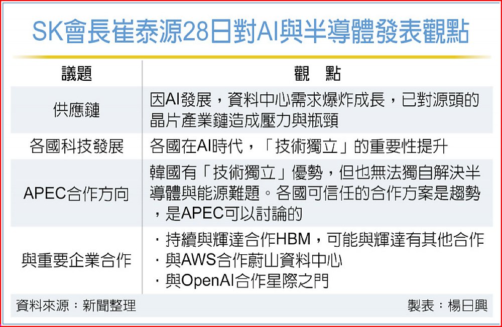 他表示,韓國有基礎設施、有AI模型,在「技術獨立」方面處於領先,但強如韓國亦不可能單打獨鬥,擺脫半導體與能源瓶頸。尤其現在整個產業因AI、資料中心需求爆炸成長,幅度已往源頭壓迫到整個晶片供應鏈。各國下一階段應朝向和諧,建立可信任的合作方案,這是APEC可探討的重要事項。他並強調,韓國無法單打獨鬥,但其自有的條件,將是試驗解決AI新問題的最佳地點、AI發展最快最普及的地方。
