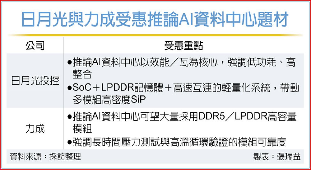 另一方面,力成則鎖定記憶體模組測試商機。推論型AI資料中心未來可望大量使用DDR5/LPDDR高容量記憶體模組,雖不像訓練型資料中心仰賴HBM堆疊,但其高頻穩定性與低功耗需求,使模組必須經過長時間壓力測試與高溫循環驗證。力成測試產線利用率可望提升。
