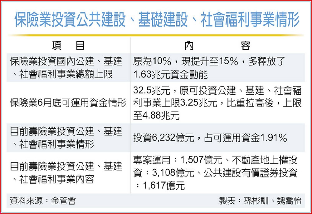 保險業投資公建、基建資金活水來了!保險局主秘古坤榮28日宣布「保險業資金辦理專案運用公共及社會福利事業投資管理辦法」修正發布,保險業投資國內公建、基建、社會福利事業的總額上限,將從現行10%提升至15%,釋放了兆元資金動能,讓保險業資金更有效率投入國家發展重點建設與實體經濟。