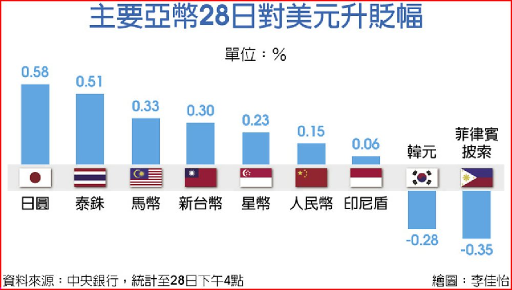 而整體亞幣28日同步走揚,日圓大漲0.58%領升、泰銖勁揚0.51%、馬幣續升0.33%、新台幣升值0.3%居中、星幣升0.23%、人民幣升0.15%、印尼盾升0.06%,而韓元下挫0.28%、菲律賓披索貶0.35%。