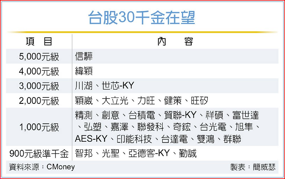 台股28日雖進入創高後震盪,部分千金股反而逆勢衝鋒,內外資近期鎖定台達電、群聯、雙鴻大開目標價調升Party,股價明顯強勢,台達電合理股價上看1,400元,雙鴻、群聯更於同日攜手登上千金寶座;後續還有四檔900元級高價股摩拳擦掌,股價若都順利升級,台股將現30千金。