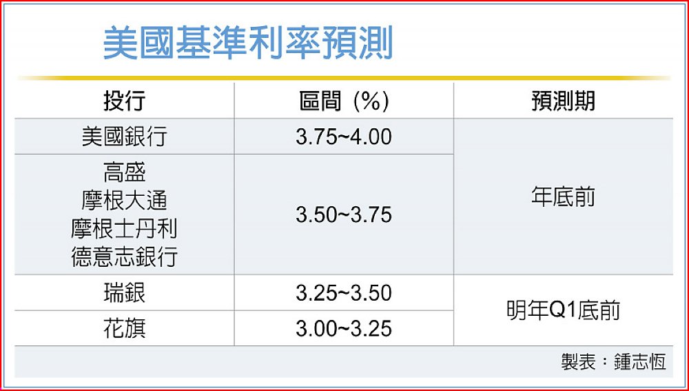 部份投行把利率預測期延長至明年首季底,像瑞銀預期Fed會降息至3.25%到3.5%區間,花旗則預期降至3%到3.25%區間,為預期Fed最積極降息的主要投行。