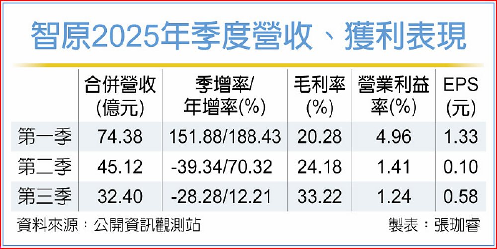 智原第三季合併營收32.4億元,季減28%、年增12%,毛利率33.2%,EPS 0.58元;從產品結構來看,IP合併營收季增幅43%,達4.1億元、NRE季增19%,達4.9億元;量產(MP)季減39%,達23.3億元。展望第四季,管理階層預期短期回檔,然全年將寫歷史新猷。