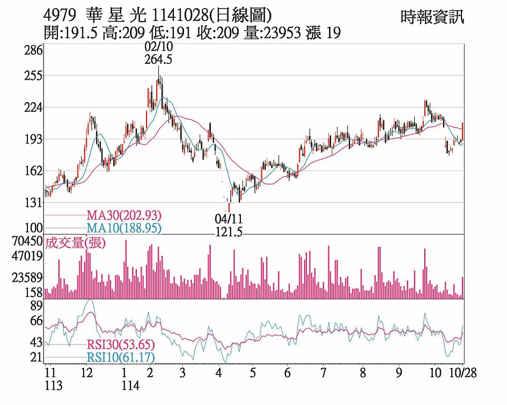華星光(4979)28日以191.5元開出,短暫震盪後買盤湧入,股價一路拉升至鎖住漲停,終場收在209元,上漲19元,成功突破短期壓力區,中長期均線走強,買盤動能重新啟動,成交量放大至2.36萬張,為10月中旬以來新高,呈現「價漲量增」格局。