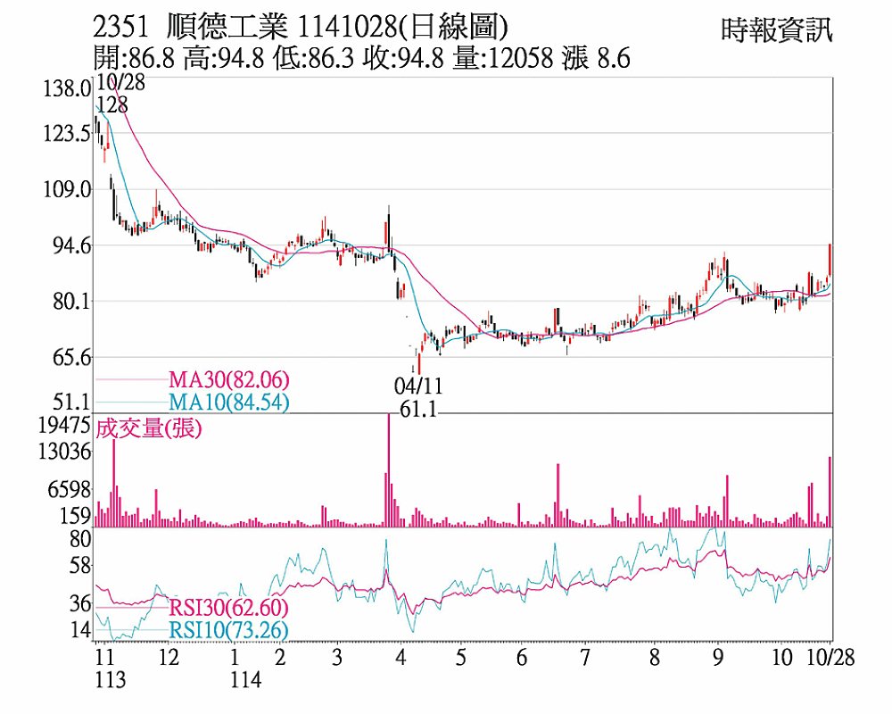 順德(2351)28日一開盤,股價在平盤上震盪整理,後因外資與自營商聯袂買超帶動下,股價急升走高,收盤前亮燈漲停,終場就收漲停價94.8元,上漲8.6元,成交爆量逾1.2萬張,其中外資買超886張、自營收買超388張,三大法人持股比重分別為外資7.95%、自營商0.71%、投信掛零。因委買逾1.06萬張,委賣掛零,若主力力挺,加上外資力挺,股價後市仍有可為。