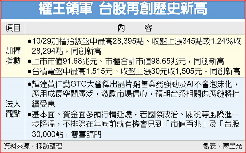 輝達黃仁勳GTC「開金口」,台積電29日股價創新高,市值突破39兆元,加上鴻海等權值股跟進表態,推升加權指數盤中大漲446點至28,395點,收盤漲幅收斂,仍大漲345點收28,294點,盤中、收盤點數同創新高站上28K,市櫃合計市值達98.65兆元,叩關百兆元新里程碑。