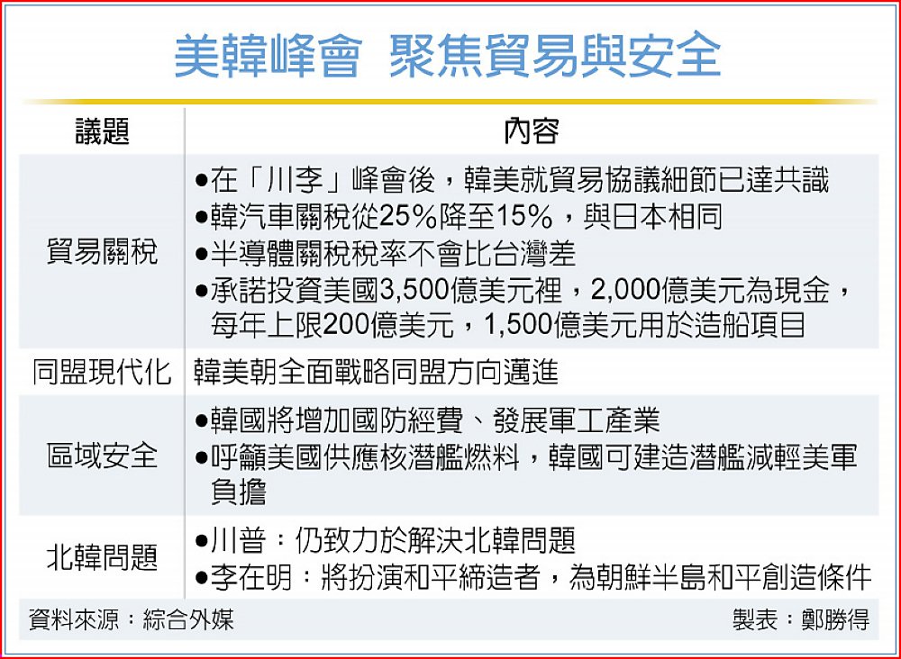 美國總統川普29日與韓國總統李在明進行美韓領袖峰會,在會議結束後川普宣布兩國已敲定貿易協議。美國決定將韓國汽車關稅從25%降至15%、與日本相同,美對韓半導體關稅稅率不會比台灣差。在韓對美投資方面,維持3,500億美元投資額,其中2,000億美元採現金分期投入,其他1,500億美元則是韓企對美投資。