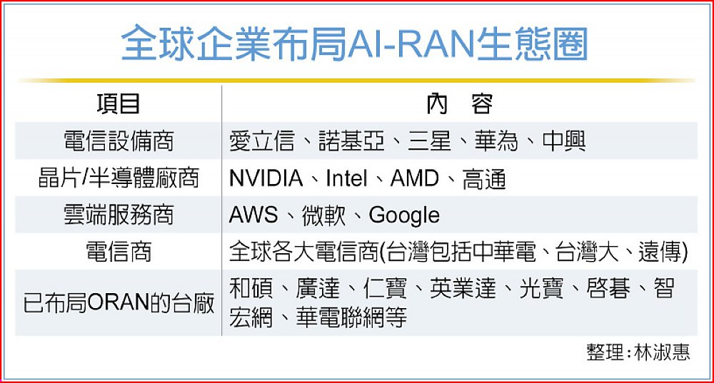 全球行動通訊邁入AI大航海時代,NVIDIA宣布以10億美元投資電信設備商諾基亞(Nokia),攜手發展AI-RAN(Radio Access Network)及6G市場。市場人士分析,台廠在政策做多加持下、早已在開放式無線接入網路(Open RAN)成為全球產業供應鏈重鎮,未來在AI-RAN市場將率先取得優勢,晶片商、網通廠、甚至雲端商都有機會雨露均霑。