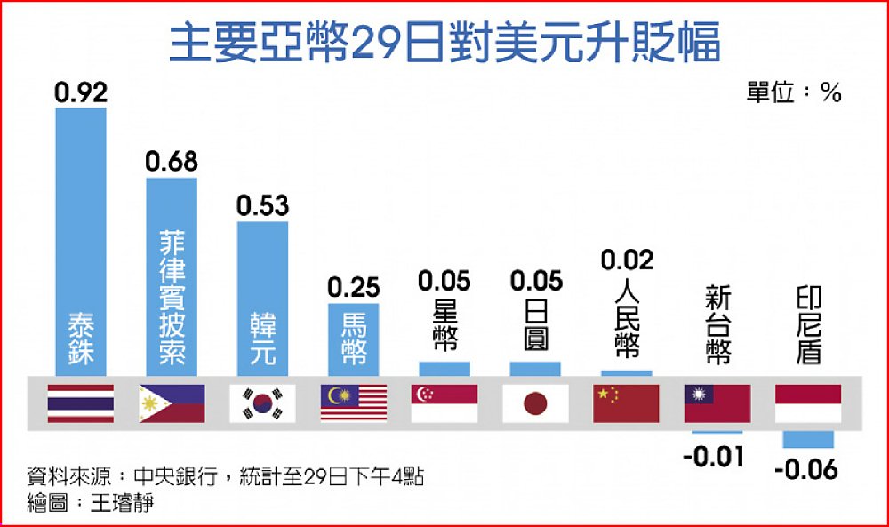 匯銀主管指出,美國財政部下半年匯率報告隨時出爐,加上台美貿易談判接近公布階段,央行盤中防守更謹慎,但為避免升速失控,29日尾盤出手穩匯,導致主要亞幣幾全面升值,新台幣由升反貶,儘管新台幣反向貶值,但貼近整體亞幣波動區間,短線持續向30.5元叩關,預估本周仍是偏升格局居多,但央行在場邊伺機而動,升幅不至於過大,關鍵還是看聯準會降息後的會後聲明,並關注點陣圖對後續利率走勢展望,及中美貿易談判結果。
