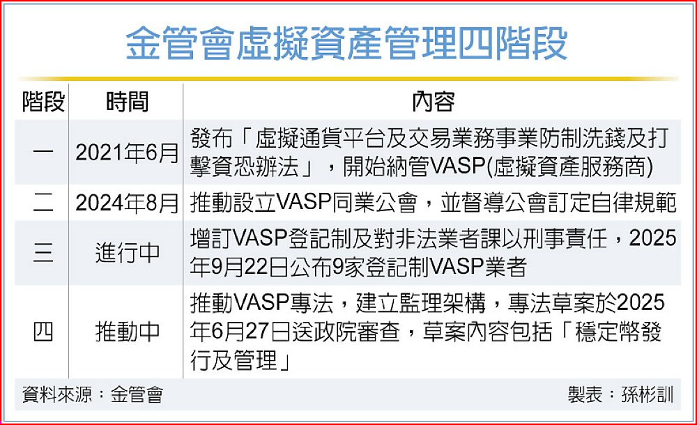 報告內容指出,金管會對「具金融投資或支付性質」虛擬資產的管理,主要參考國際趨勢,以洗錢防制及打擊資恐為監理基礎,採漸進強化VASP管理方式,分四階段逐步納管。目前已進行至第三階段,今年9月22日公布九家登記制VASP業者。第四階段則是推動VASP專法立法管理,專法草案已於6月27日送行政院審查中。