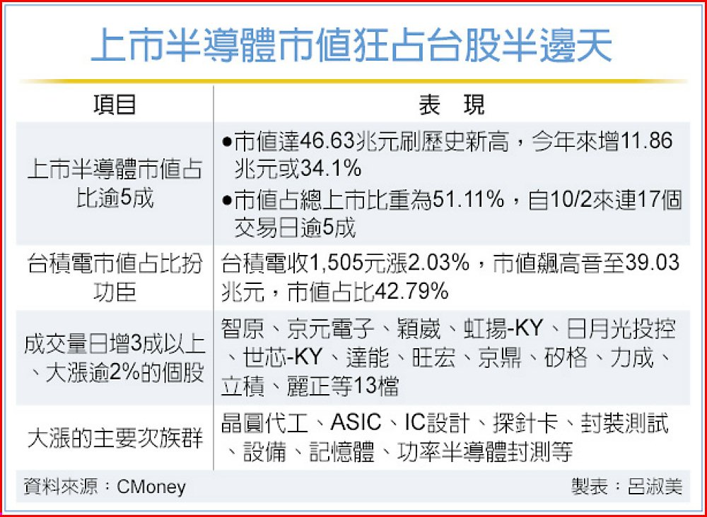 29日上市半導體市值46.63兆元、刷歷史新高,據統計,今年來增11.86兆元、增幅34.11%,而上市半導體市值占總上市比重為51.11%,為10月2日來連17個交易日超過5成,半導體狂占台股市值半邊天。