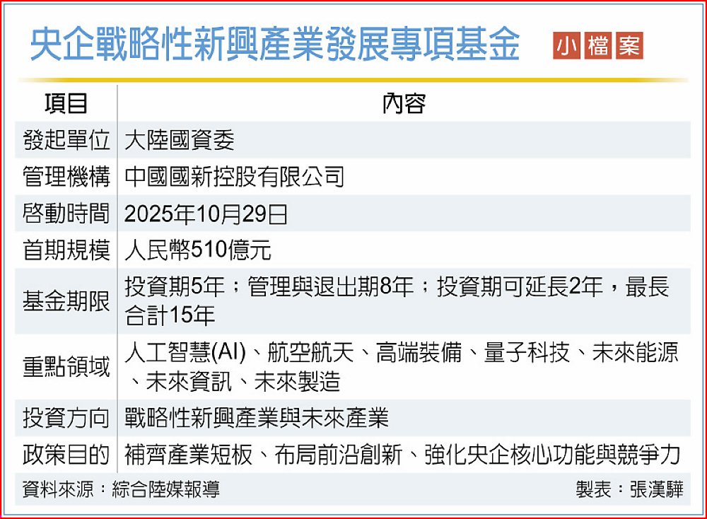 大陸「十五五規劃建議」全文28日公布後,北京迅速備妥銀彈。由大陸國務院國資委發起,委託中國國新控股公司設立和管理的「中央企業戰略性新興產業發展專項基金」29日在北京啟動,首期規模達人民幣(下同)510億元,將重點挹注人工智慧(AI)、量子科技等戰略性新興產業,加速技術創新與產業升級。