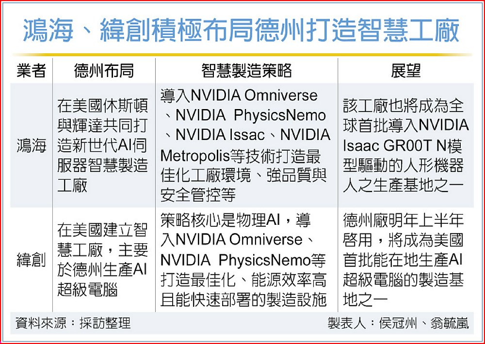 緯創今年以來已陸續注資達7.61億美元,建置位於達拉斯的Westport及Eagle新廠,預計在2026年上半年開始量產,成為美國首批在地組裝生產及測試AI超級電腦製造基地之一。而鴻海休士頓廠則除了AI supercomputing產品線外,也將成為首批導入NVIDIA Isaac GR00T N模型驅動的人形機器人生產基地之一。
