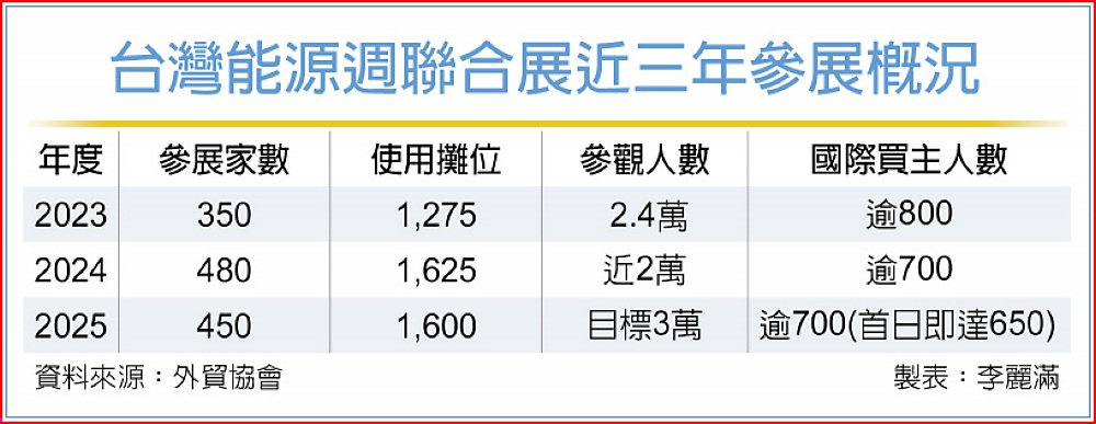 台灣國際智慧能源週(Energy Taiwan)與淨零永續展(Net-Zero Taiwan)29日起聯合開展,外貿協會董事長黃志芳指出,今年「一站式」呈現儲能、氫能、綠能、太陽能等最新科技與金融服務,共有450家國內外企業、使用1,600個展位,其中以歐洲為首的國外參展商占20%,該展已然成為亞洲能源技術交流平台。