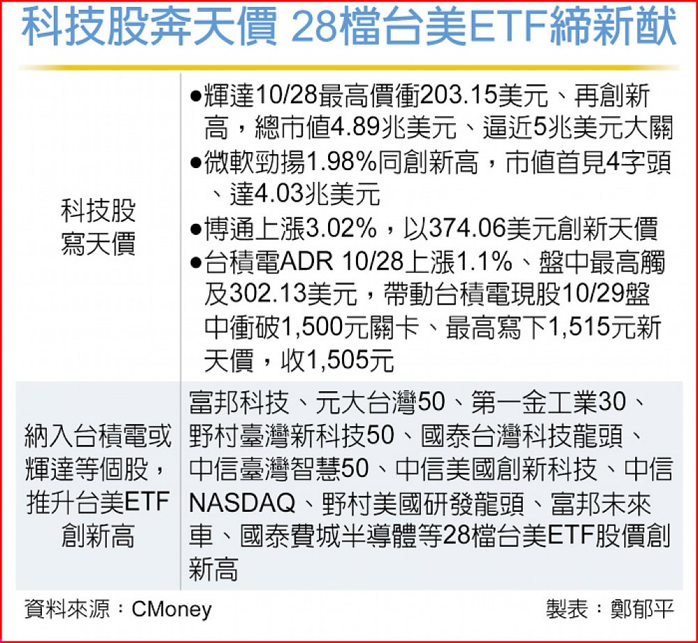台美科技股屢創新高,含相關個股ETF也沾光,盤點成分股中含有輝達、微軟、博通、台積電等股價創高「明星股」之台美ETF,共有高達28檔股價29日締造掛牌新高,分別為15檔海外型ETF及13檔國內指數型ETF。