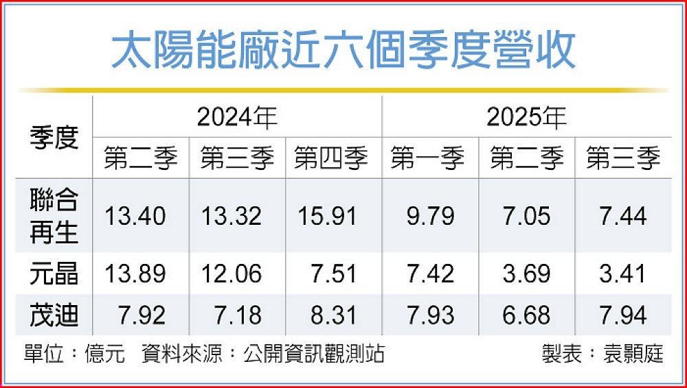 太陽能廠迎海外商機,看好明年營運表現將優於今年。茂迪(6244)拿下日本模組大單,今、明年陸續出貨,海外營收占比上看7成,支撐獲利表現。元晶(6443)、聯合再生(3576)直言美國太陽能電池會是剛性需求,明年開始出貨,營收占比可望突破5成。