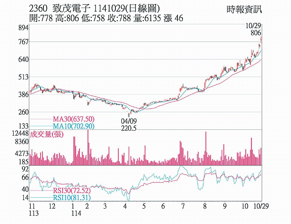 致茂(2360)30日董事會將通過第三季財報。受惠第三季營收表現不俗,提前上演慶祝行情,29日以778元紅盤開出,盤中短多資金續搶,推升股價最高觸及806元歷史新高,終場雖以788元作收,單日漲幅6.2%,單日上漲46元,成交量放大至6,056張。