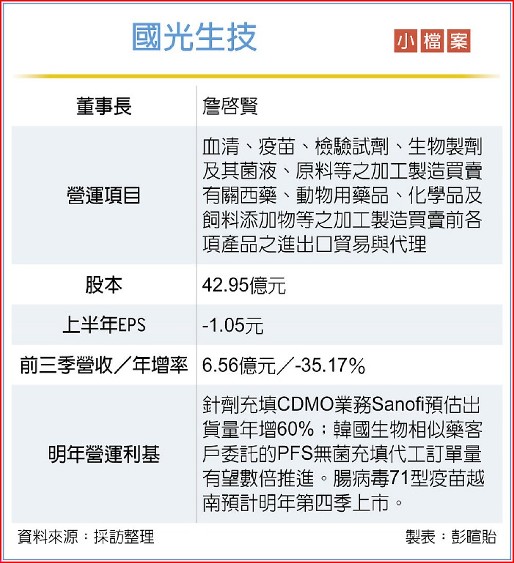 國光生(4142)海外布局、代工業務升溫發酵,明年營運加速衝刺、添利。其中針劑充填CDMO業務正處成長期,代工客戶Sanofi(賽諾菲)預估出貨量將從今年的500萬劑成長至明年的800萬劑;韓國生物相似藥客戶委託的PFS無菌充填代工也預計隨客戶陸續於歐、加、韓、日等國家上市,預估明年訂單量將比今年的20萬劑展現數倍推進力道,助力國光生明年營運大幅活絡躍進。