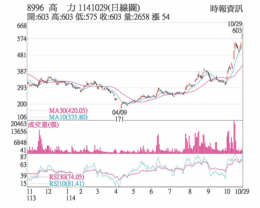 高力(8996)受惠AI伺服器散熱系統與燃料電池反應盒需求大增帶動業績成長,29日漲停603元開出,盤中雖有打開,但隨即鎖至終場,成交2,563張,籌碼上外資連10日買超。