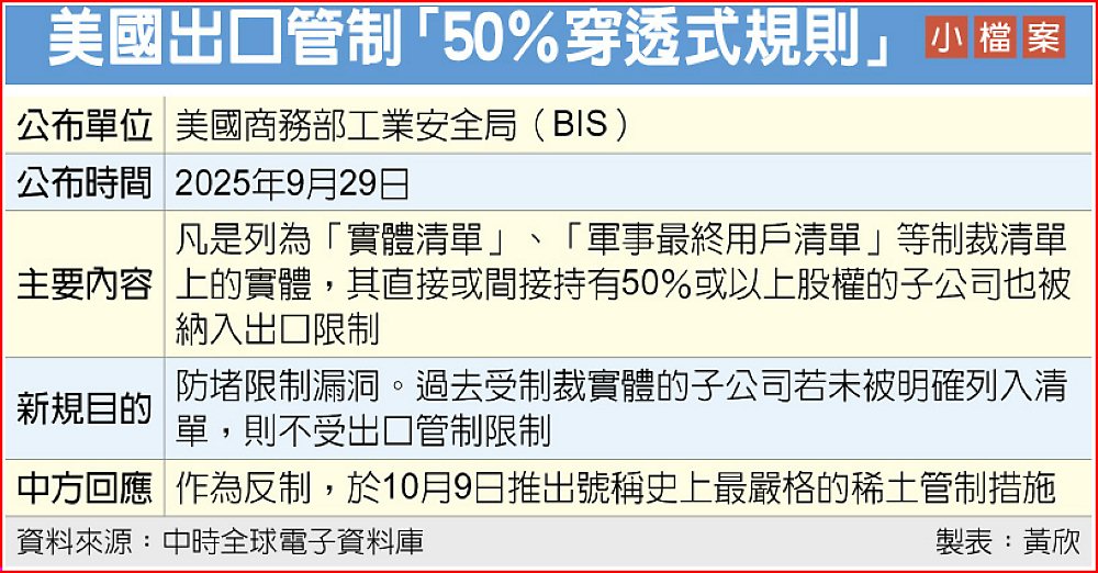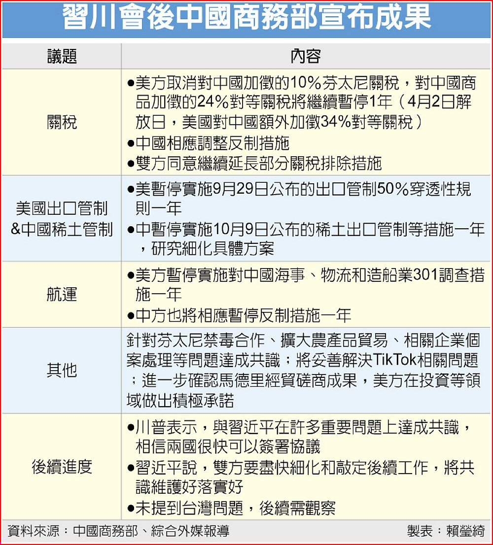 出口管制方面,美將暫停其9月29日公布的出口管制50%穿透性規則一年,中方則暫停實施10月9日公布的稀土相關出口管制等措施一年並將研究細化具體方案。