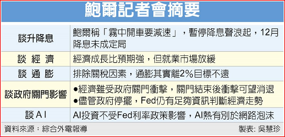 聯準會(Fed)主席鮑爾會後記者會上意外轉鷹,對市場降息期待潑冷水。由於Fed內部政策立場明顯分歧,加上政府關門效應,對於未來利率走向,鮑爾形容像「霧中開車要減速」,暗示12月未必降息。