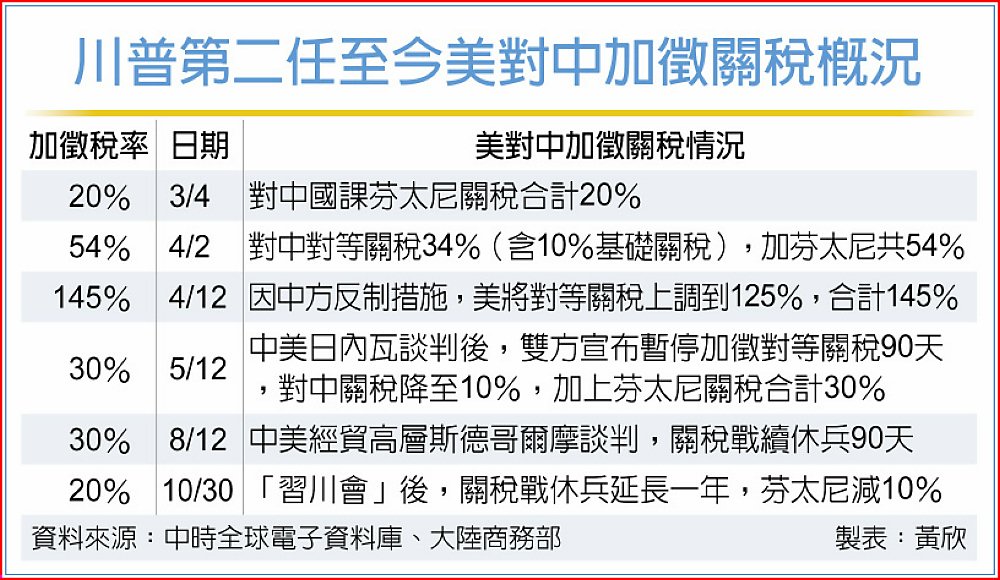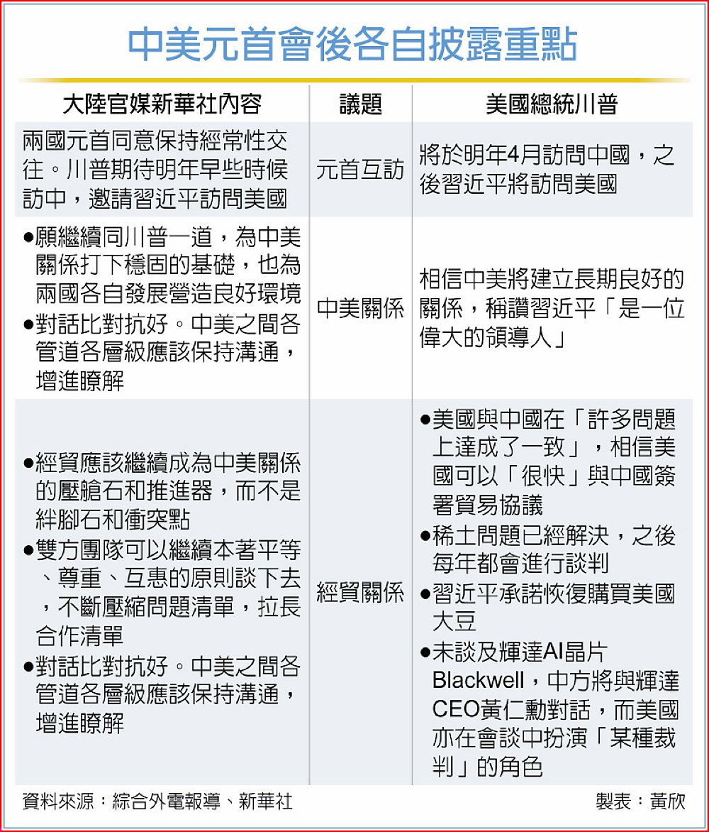 川普會後表示,已與中國就稀土和關鍵礦產問題達成為期一年的協議,並表示美國向中國加徵的芬太尼關稅將從20%下調至10%,立即生效。兩人有談論輝達的問題,但未談及輝達高階AI晶片Blackwell,不過中方將與輝達CEO黃仁勳對話,美國亦在會談中扮演「某種裁判」的角色,此外,與習近平會晤未談到台灣。